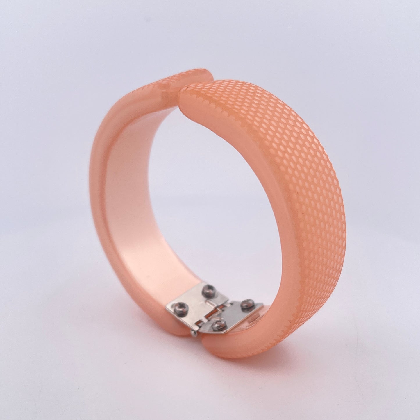Cet élégant bracelet en résine de la collection Apricot Dust présente des textures uniques gravées au laser. Chaque pièce est dotée d'un élégant fermoir à charnière, alliant style et confort en toute simplicité.
