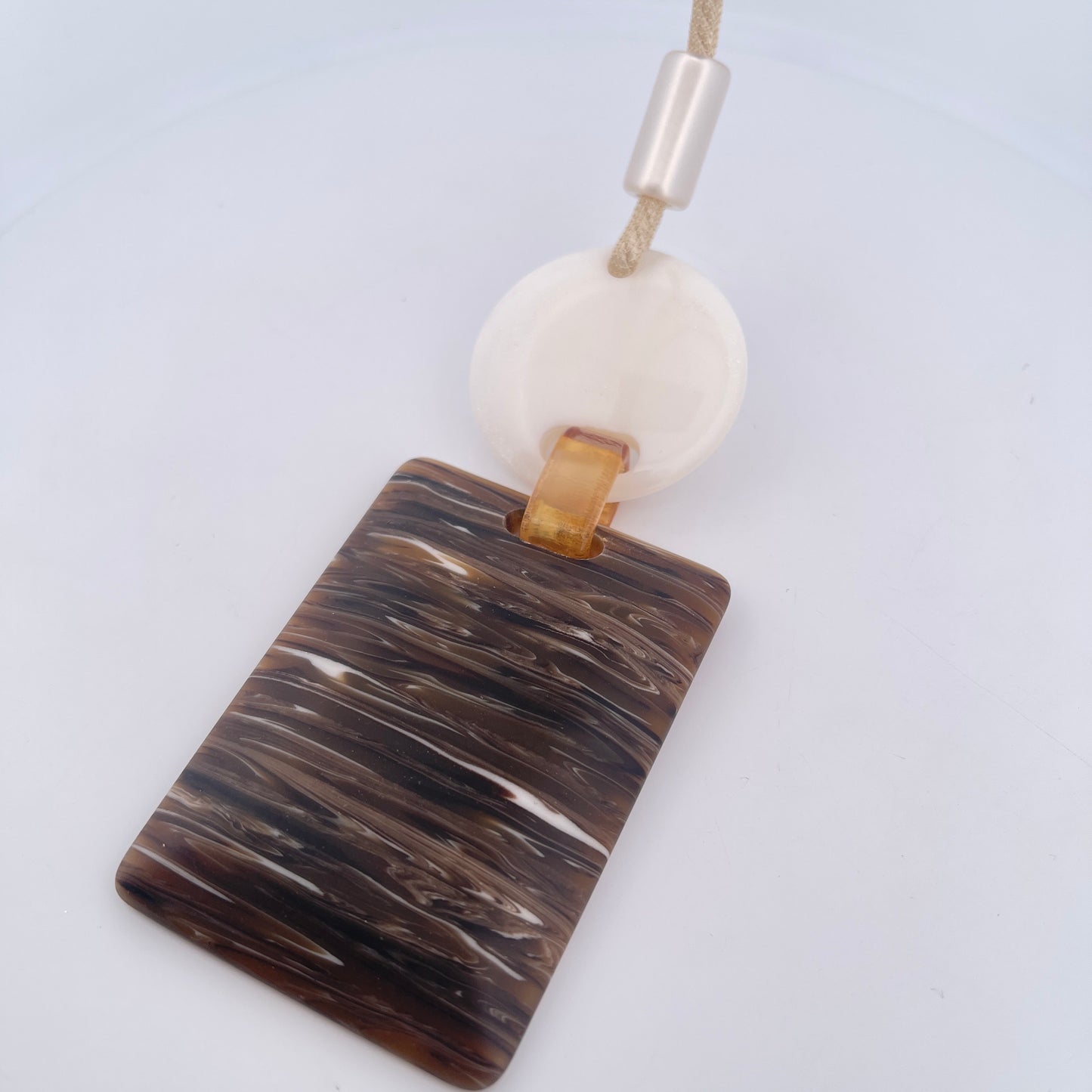 This stylish necklace features a unique brown and white striped pendant paired with a sleek white disc. The pendant hangs gracefully on a durable cord, making it a perfect accessory for any outfit. Its eye-catching design adds a touch of elegance and charm, ideal for both casual and formal occasions. The length of this necklace is versatile.