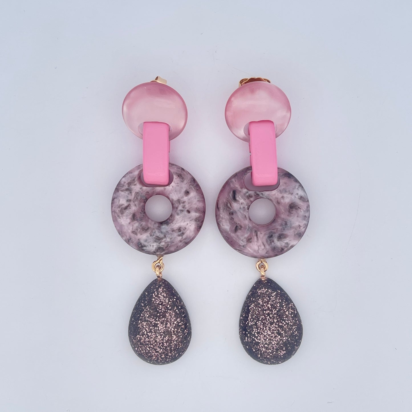 These striking earrings feature glossy pink studs, marbled resin hoops, and glittery dark brown teardrop dangles. The bold combination of textures and colors creates a unique, statement-making design perfect for elevating any look.