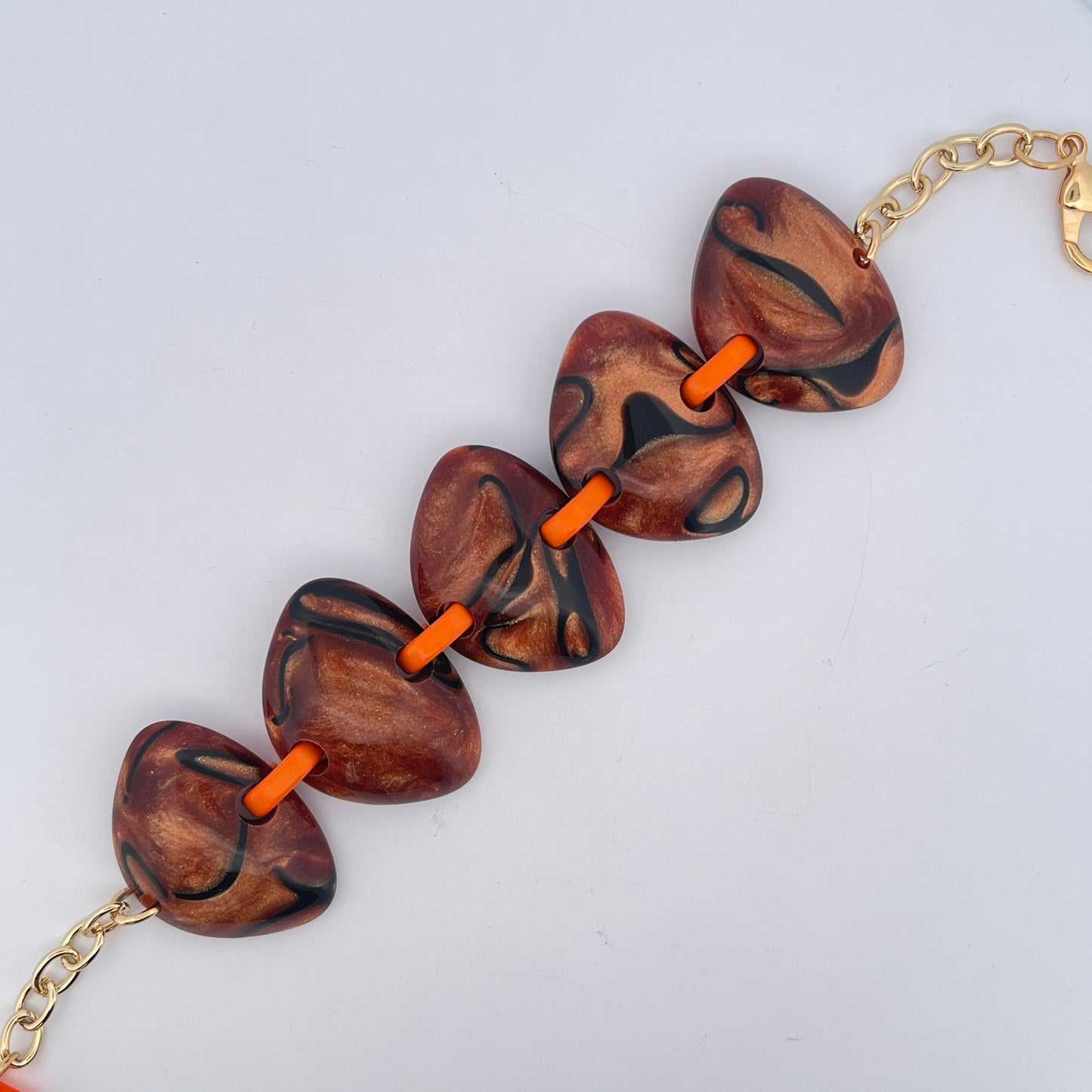Warm amber tones and a glossy swirl finish make this bracelet a statement piece with a playful twist.
