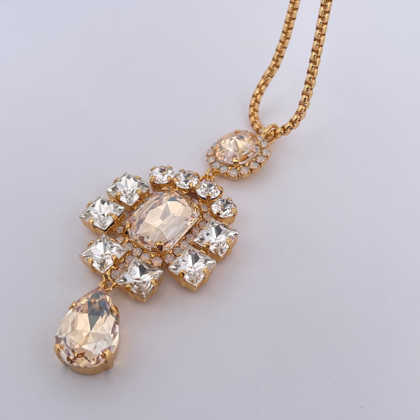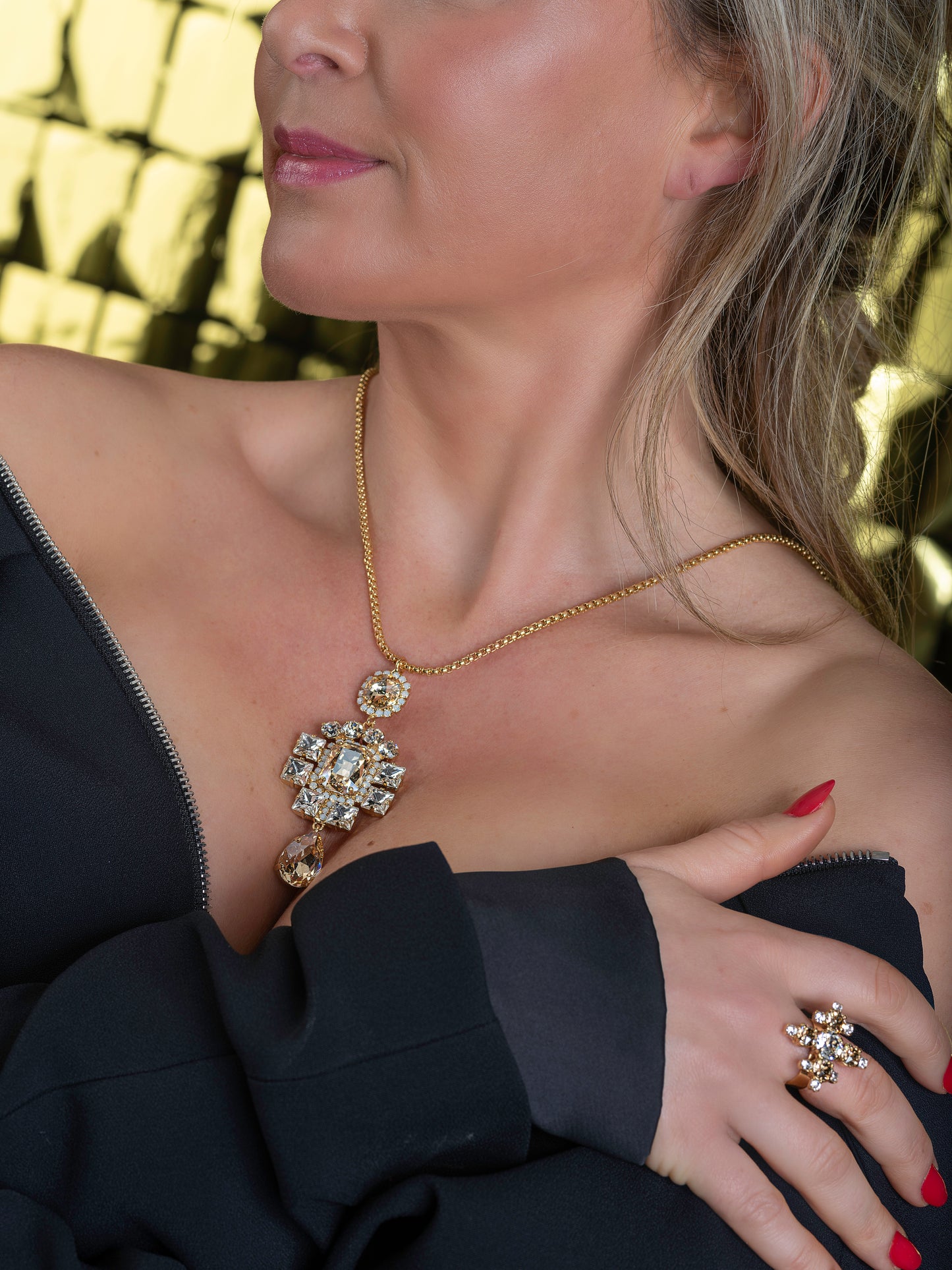 This necklaceis a beautiful gold piece adorned with a large, fancy pendant and sparkling crystals. It is a versatile accessory that can be worn with various outfits, from casual to formal attire. The gold color and intricate design make it a perfect statement piece to elevate any look. The necklace can be worn alone or paired with other gold or diamond jewelry for a more elaborate look. It is perfect for special occasions, such as weddings, galas, or holiday parties, or simply as an elegant addition to everyday wardrobe.